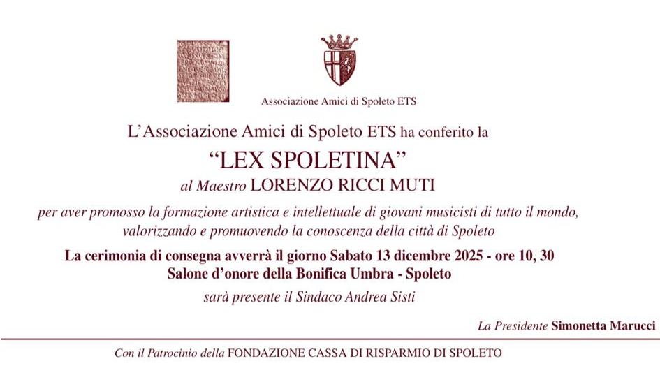 L’associazione Amici di Spoleto ha conferito la Lex Spoletina al Maestro Lorenzo Ricci Muti per aver promosso la formazione artistica e intellettuale di giovani musicisti di tutto il mondo, valorizzando e promuovendo la conoscenza della città di Spoleto.