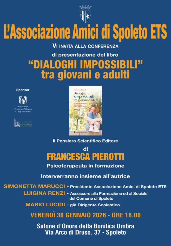 C’è stata una partecipazione oltre ogni aspettativa a Spoleto venerdì 30 gennaio nel Salone d’onore della Bonificazione Umbra in Palazzo Leti Sansi alla presentazione del libro della psicoterapeuta Francesca Pierotti dal titolo “Dialoghi impossibili tra giovani e adulti” (Il Pensiero scientifico Editore, 2024). Con l’autrice hanno dialogato Simonetta Marucci, medico e presidente dell’Associazione Amici di Spoleto ETS, e Mario Lucidi, già docente e dirigente scolastico. A portare i saluti istituzionali del Comune di Spoleto è stata l’assessora alla formazione, Luigina Renzi.